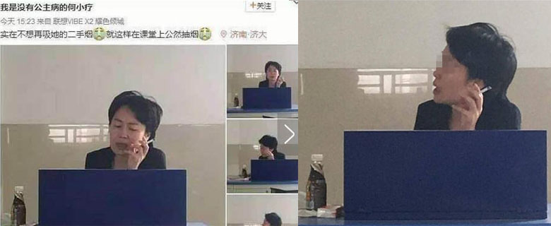 5月6日,下午15点23分许,网友 @我是没有公主病的何小疗 爆料:实在不想再吸她的二手烟,就这样在课堂上公然抽烟!我们可以从照片上看出,该名教师左手拿着烟卷,表情随意。据网友消息,该老师给学生上的是专业外语课,并且是从美国留学回来的女性教师。(5月8日新文化网)