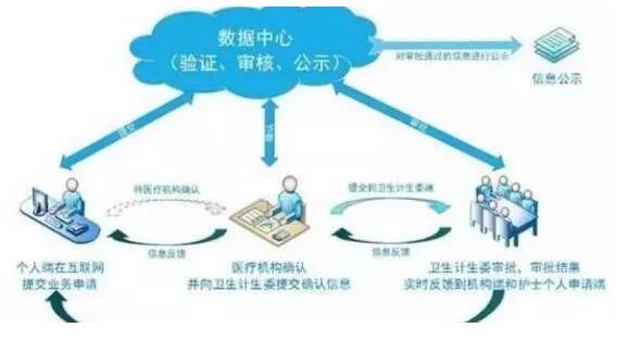 申请人在护士个人端登录系统后,按规定和系统提示提交申请。所提交的申请经执业机构审核确认后,提交负责行政审批的行政主管部门办理。审批行政主管部门审批通过的信息,将依据政务公开的规定,通过当地政府指定的信息发布渠道和国家卫生计生委的网站予以公开。总体流程如图所示: